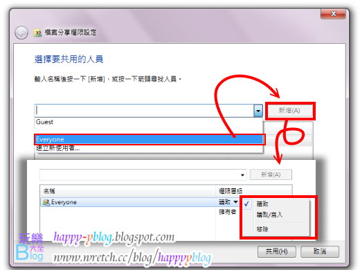 然後按下共用(S)開啟「檔案分享權限設定」,來選擇要共用的人員,如果想要大家共用檔案,就可以把「Everyone」人員新增到擁有權限的名單內;如果想要分享給特定人員時,就必須選擇「建立新使用者」。若是想要設定人員共享的權限層級,只要按下向下的箭頭,就可以在此設定讀取、讀取/寫入,或是把此人員從擁有權限的名單內移除。